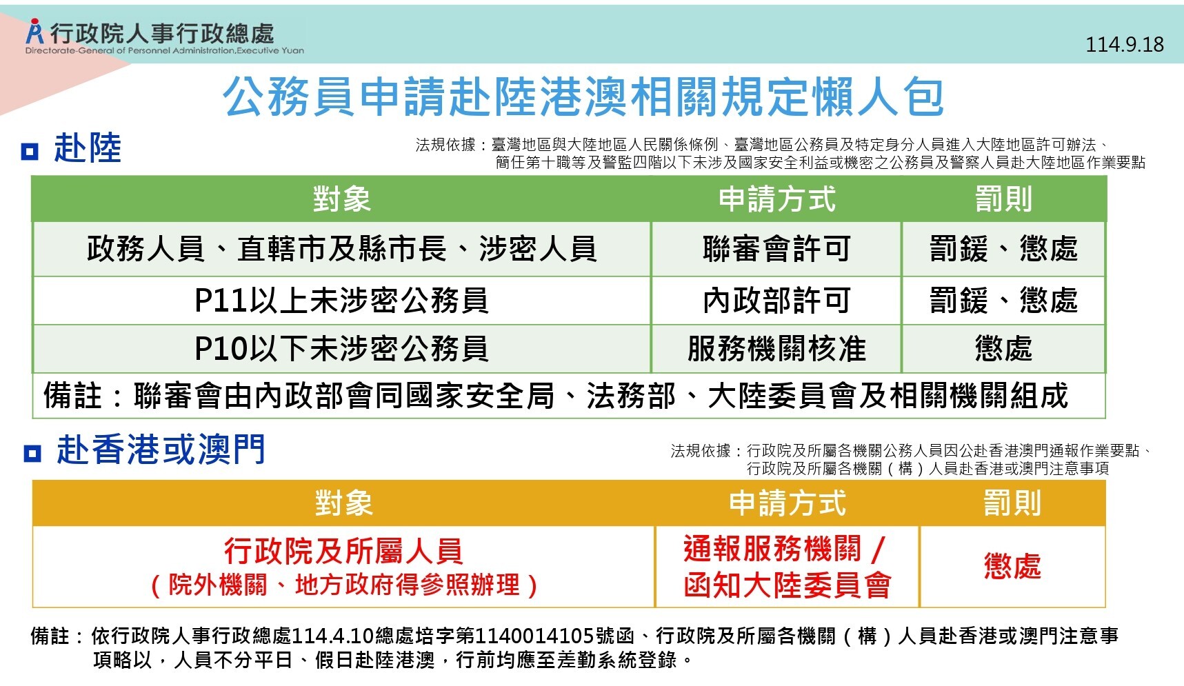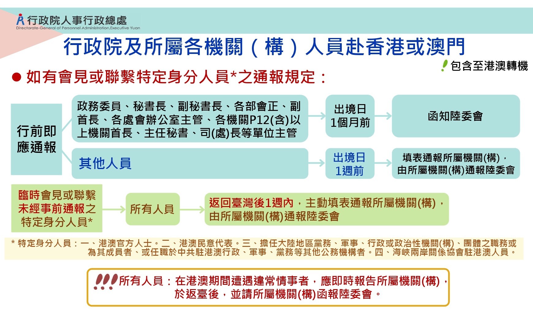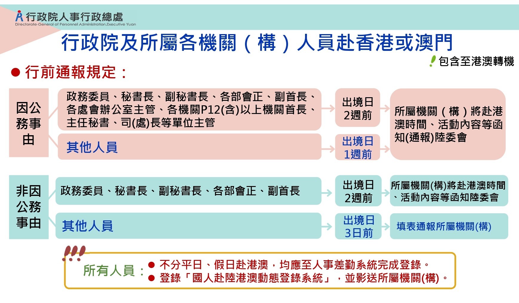 一、行政院業以114年9月10日函修正「行政院及所屬各機關(構)人員赴香港或澳門注意事項」第3點、第4點,修正重點如下: